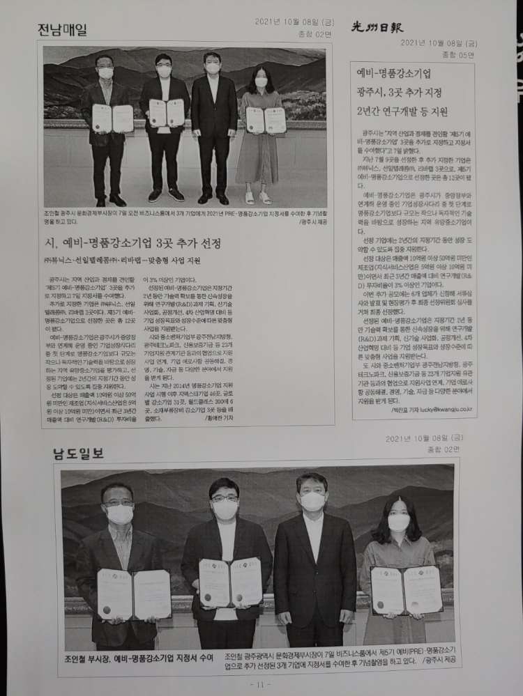 "광주시, 뷰닉스 등 예비-명품강소기업 3곳 추가 선정" 전자신문 보도